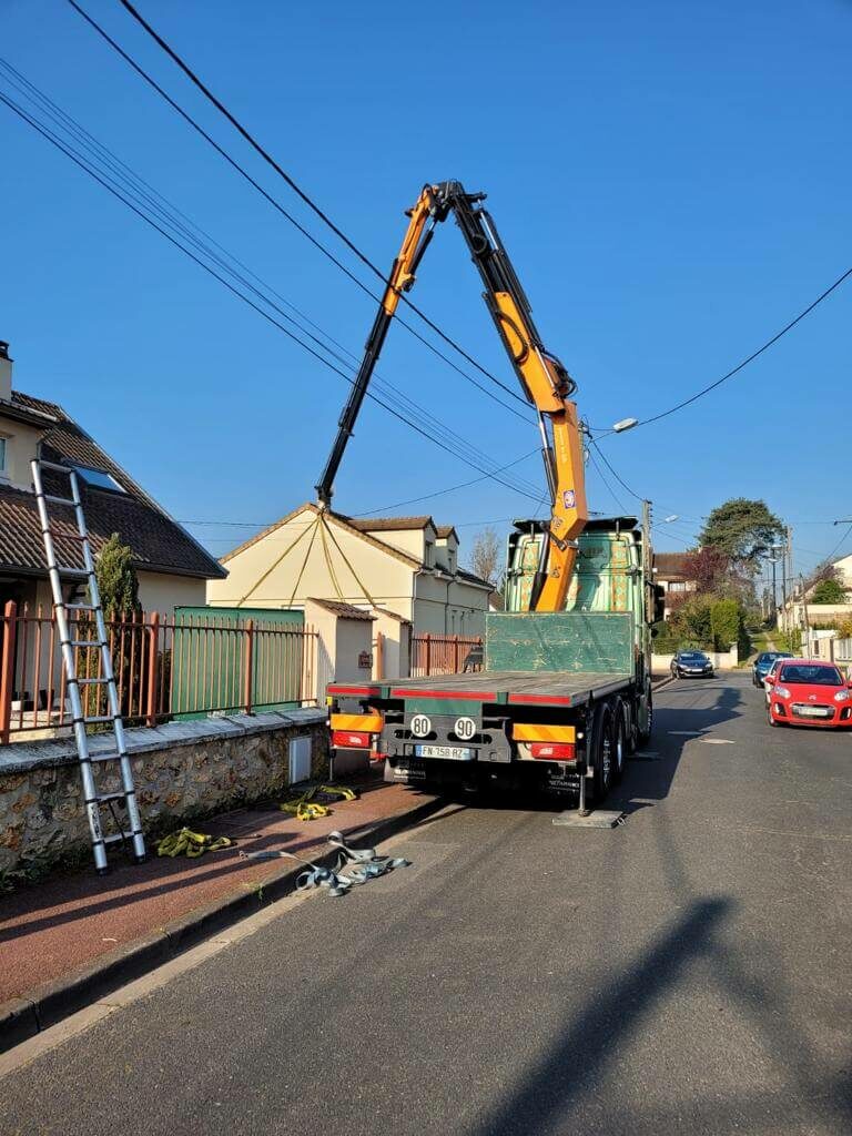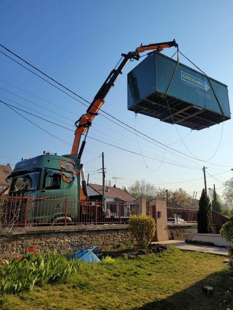 Afin de faciliter leur emménagement, Pierre-Marie a déposé la box, au plus près de l’entrée de la maison à l’aide d’un de nos camions 🚛 équipé d’une grue 🏗. La manœuvre a demandé beaucoup de précisions ⚡️⚡️ : bravo !