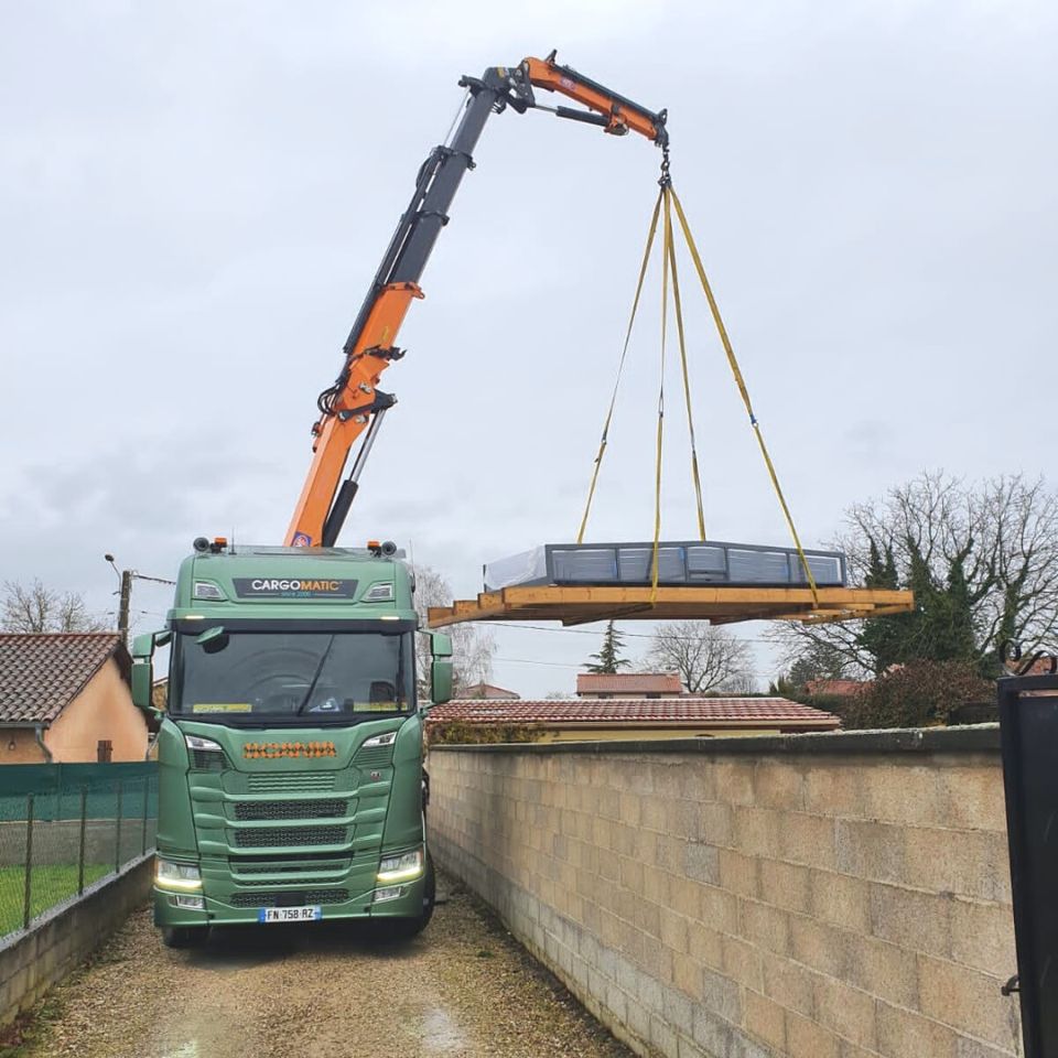 Livraison encore très délicate 🧐, celle d’un abris de piscine volumineux qui a nécessité l’utilisation d’une grue 🏗 équipée d’un Fly-jib permettant d’allonger sa portée pour déposer l’abris au plus près de la piscine 🏊‍♀️.