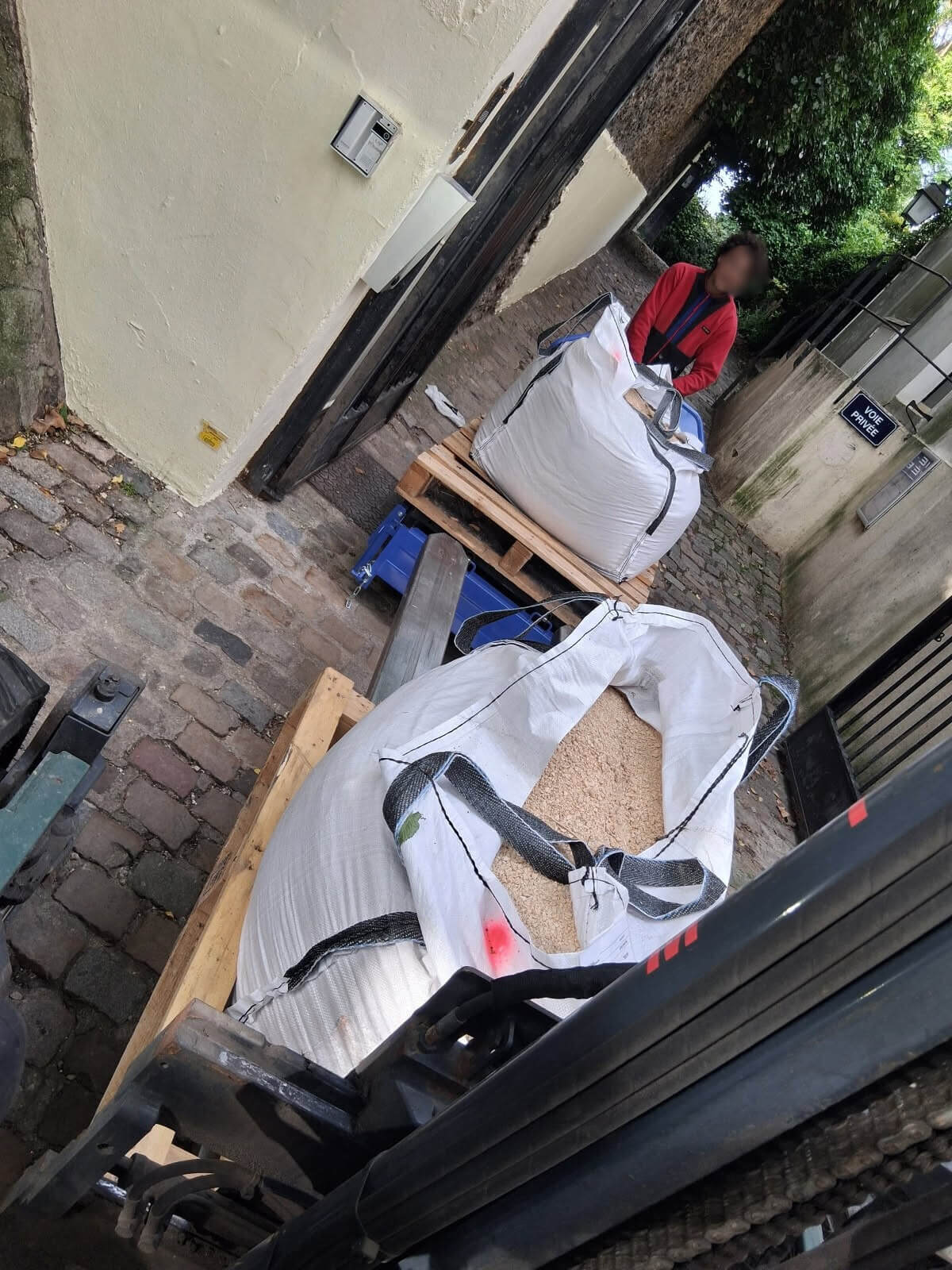 ➡️ Dépose directe de big-bags sur une terrasse difficile d’accès grâce à notre chariot embarqué.